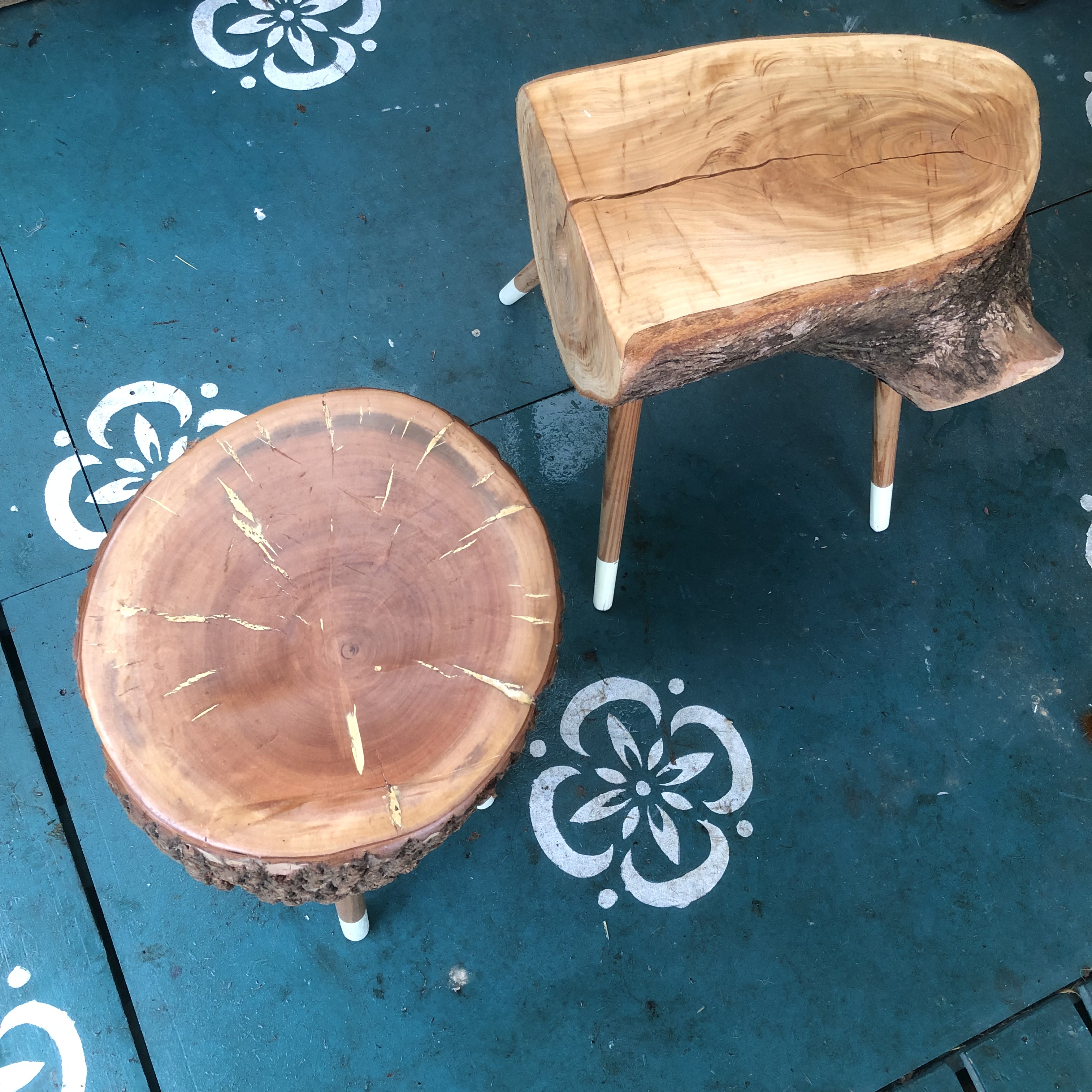 Street found logs with some finishing to the seat surface. One cut cross section and the other long section exposing the different grain patterns. Legs created from recycled coffee table legs and hardwood dowel.