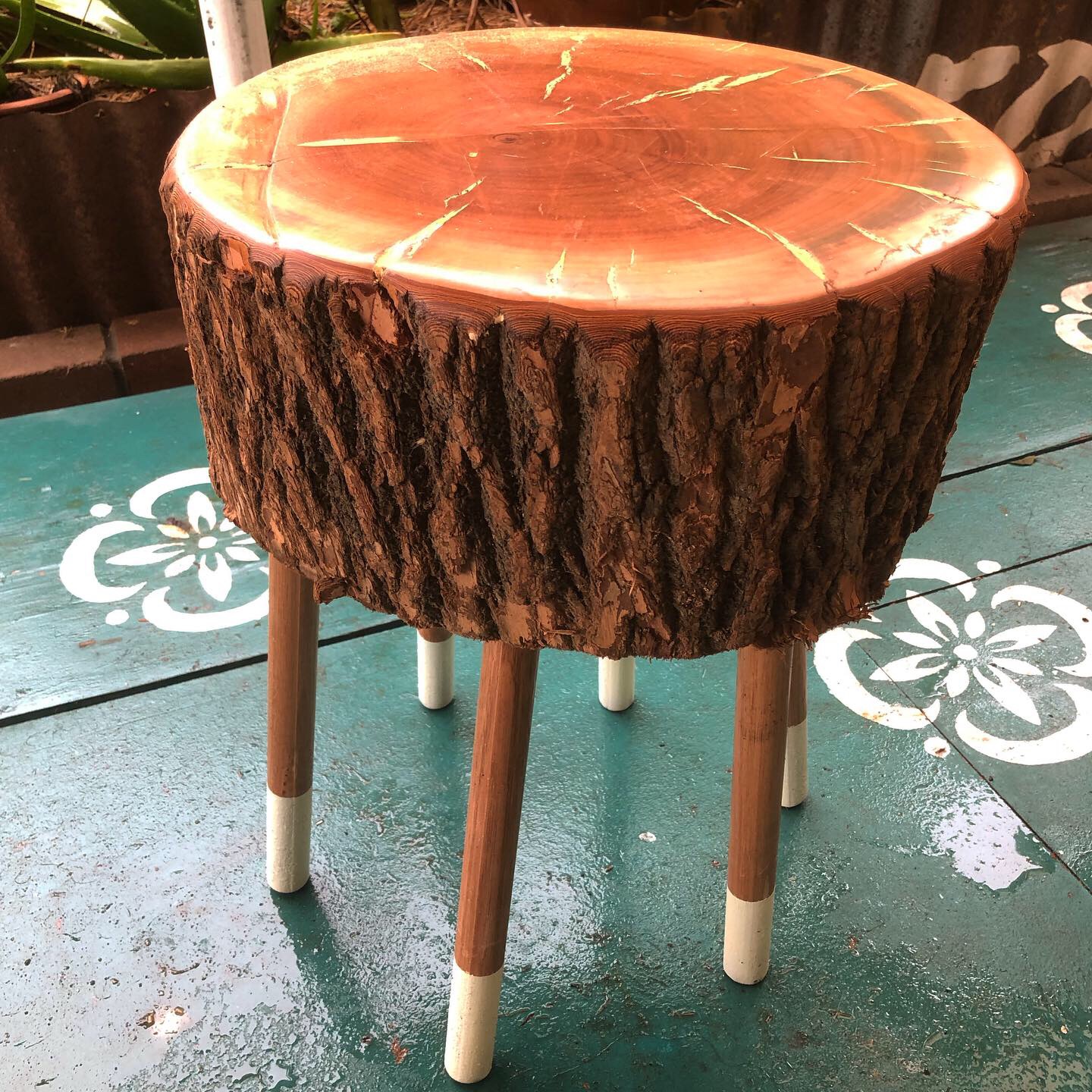 A washed up log segment and some scrap plywood reconfigured into this bedside/ chair side platform for your book and beer!