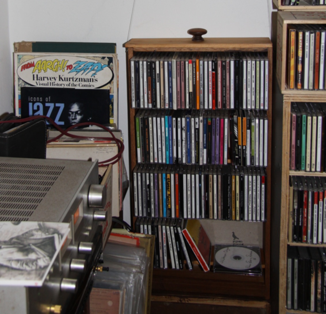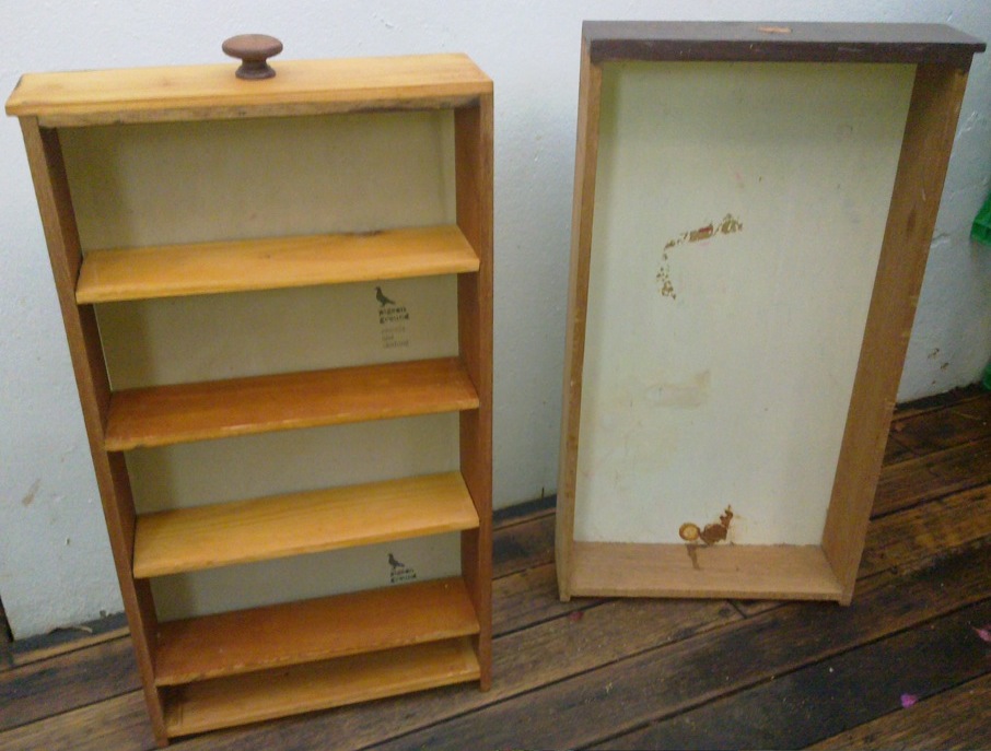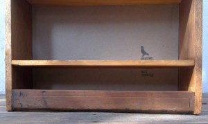 These long drawers were found in Newtown (refer pic 4) and had evidence of being been previously fixed over the years. They were cut back and shelves inserted over a backing of paper record covers (From Pigeon Ground Records). A piece of driftwood was used as a base fascia (refer pic 2) concealing the previously ‘repaired’ crooked rear of the drawer, now bottom shelf. Note the alternating timber types in the shelves.