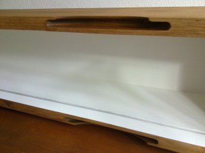 and bottom of this piece. The left and right sides are pine cut from a separate drawer. The backing is a cut down section of found timber backing board. The internal surface was painted white with house paint. Only the main surfaces being sanded and the whole external varnished creating a good contrast of darker areas within the handle detailing of the drawer faces. Some wood