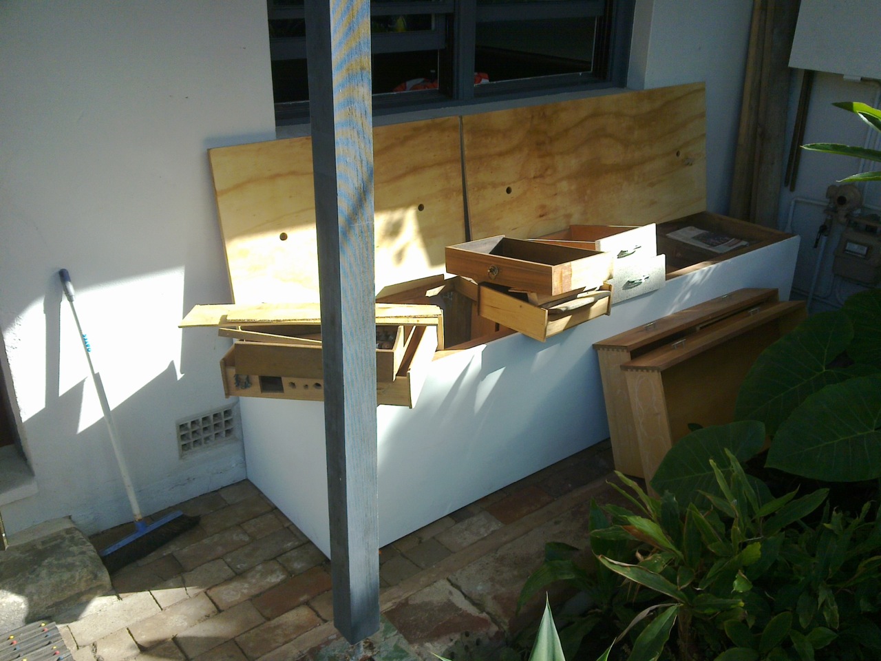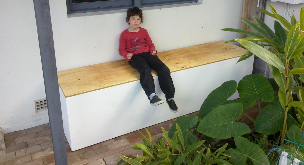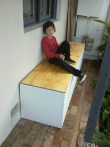 Big Box was necessitated by the accumulation of ‘ timber bits’ on the front porch. The reasoning was that the bits could largely be accommodated within a large storage volume that could double as a day bed/ stoop bench. The entire structural box frame was made from treated pine off cut lengths rescued from a skip. The end nearest the front door of the house was cut from a scrap of found ply and the back and far end were left open as A you cant see them and B this provided great ventilation to the timber within and the under house vents located in the wall behind the box. The two part lid and face were one entire sheet of ply 1200 x 2400mm cut long ways down the middle. Then the lid portion was cut to the golden mean and the remainder.