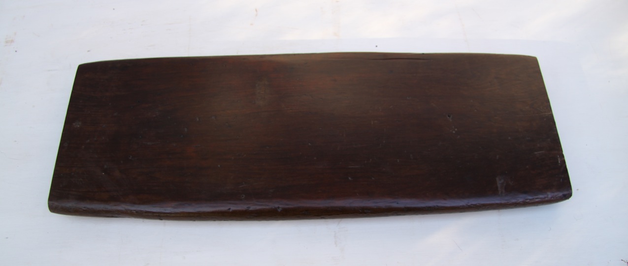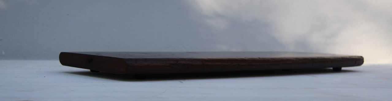 This was an easily overlooked bit of flotsam washed up south of Sydney. The ends had a stepped cut that suggested it was the lid or top of something on a boat. The timber was very pale in colour and lite in weight. All I did was cut the ends off clean and sand it all back, varnish it and screw some little stoppers under it. The surface is covered in a poetic history of nicks and depressions. The most interesting and still inexplicable thing was that when a coat of clear varnish was added to this pale timber the whole thing turned this handsome chocolate red colour. The long sides are rounded by its time at see and it is now working as a condiments board on the kitchen table.
