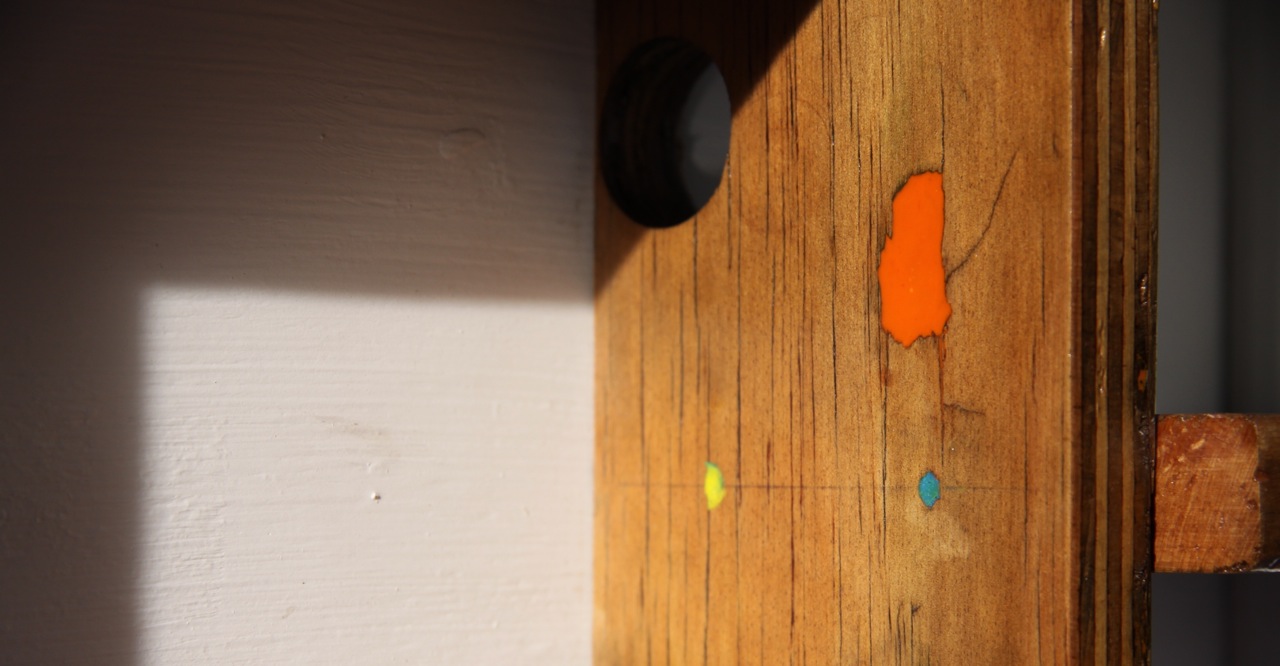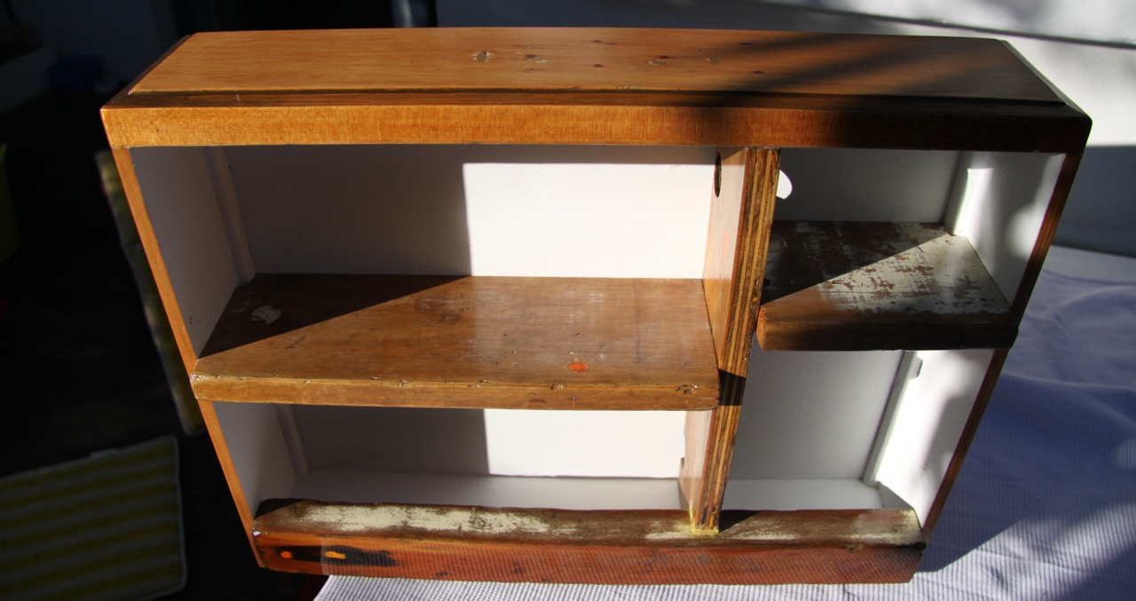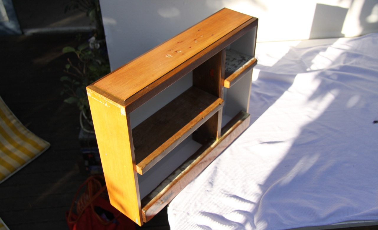 This was an old broken drawer found in the street that has had a range of different driftwood components worked into this Bauhausian protruding shelf arrangement. The vertical plywood component had some holes drilled in it when found. This worked well as a foil to the random offset rectangles created by the shelf set out. I had clamped some of the timber to work it before sanding it and the clamps left circular impressions that preserved the paint in these areas to pleasing effect. The inside shell was painted with white house paint and all the odd little holes were filled with coloured wax and scraped flat prior to varnishing. The top of the unit bears the marks of the long gone drawer handle and even a long gone makeshift replacement. The base fascia board looks like it has come off a boat. And had been in the sea for some time. The metal fittings left there black reactive stains that worked perfectly with the coloured wax fill and the orange grain of the timber as i cut it back. The unit is all varnished with a satin varnish except the base fascia in a high gloss varnish to focus attention on this stunning piece of flotsam.