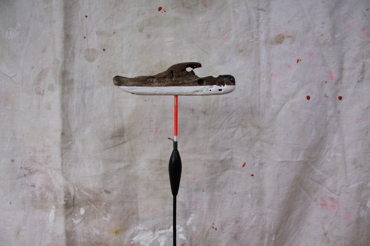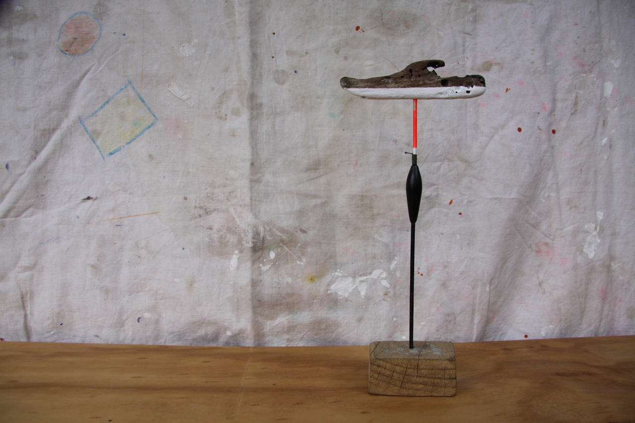 This is a simple compilation of three found objects into a kitsch little shelf sculpture. All I did was drilled two holes and white painted the piece of driftwood to make it look like a hull. For me the colours are the most pleasing aspect of this piece. Though the weighting and proportions work well too.