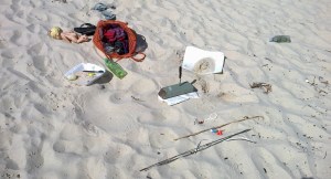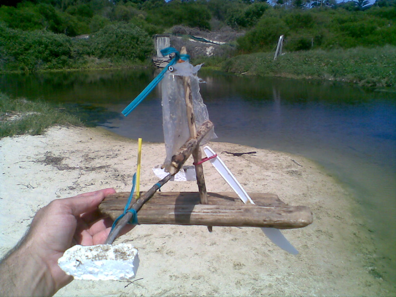 It is appropriate that this is boat 13. Never quite getting an off shore breeze it went back and forth from the beach a number of times. Picture 1 is a good example of the sort of spot where a boat is constructed. Pictures 5, 6 and 7 show the speed of this boat on the water and a test sail from the breakwater to the other side of Yarra Bay. The hull was a length of channeled pine with a cross beam of pine mitered into it with a pocket knife. A plastic bag sail on a stick frame with a cut plastic rudder and some foam outriggers. Picture 6 shows it with the additional ALDI bag sail.