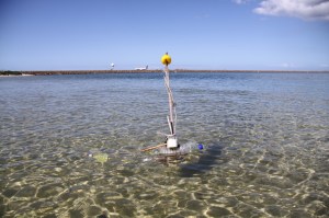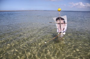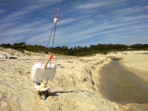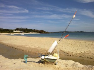 I bet this guy never thought he would reach these heights. The Steve was an ungainly thing to look at, especially the double hung sand filled bottle hull swinging under the float bottle. A foam block was used to stab in the mast and pin the ‘sail’ and also to stab in the long tail stick to give the rudder enough leverage to keep this big lug on a straight uncorrupted path (right Steve!). The yellow ball was stuck on top to help visibility as she went out deeper.