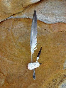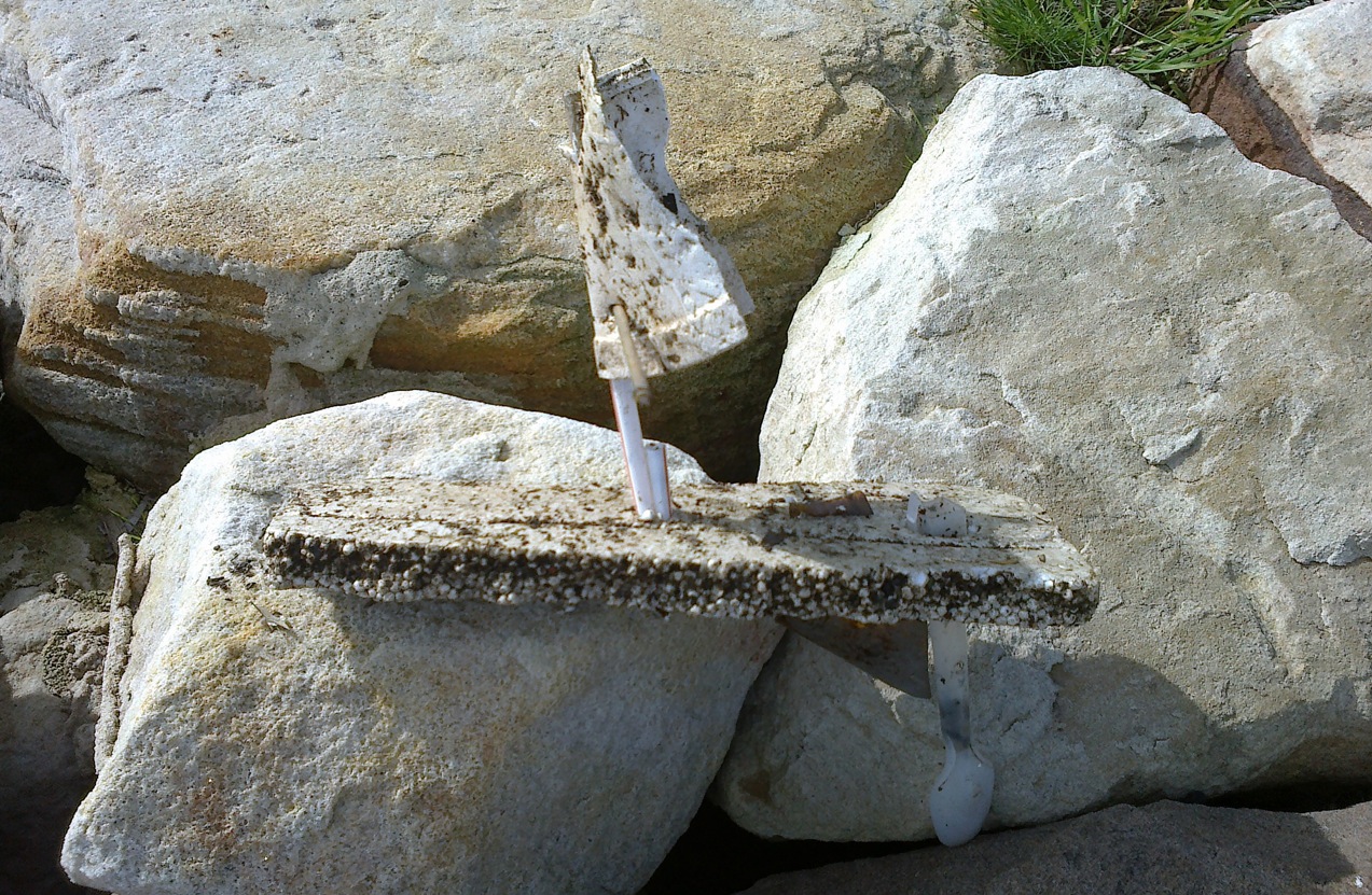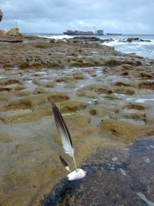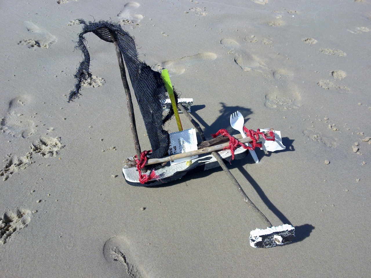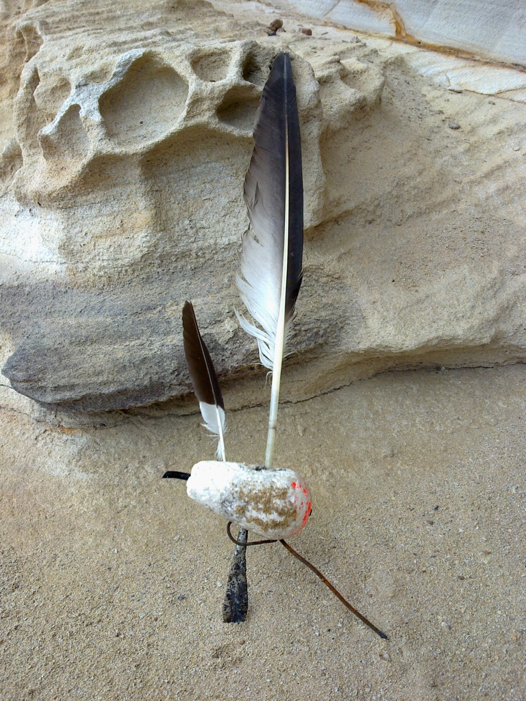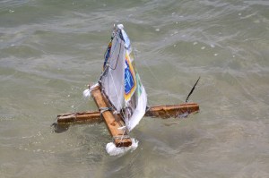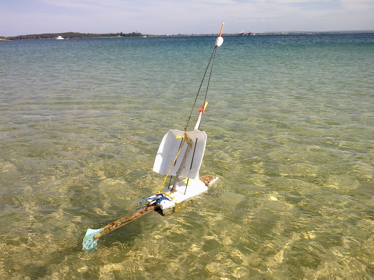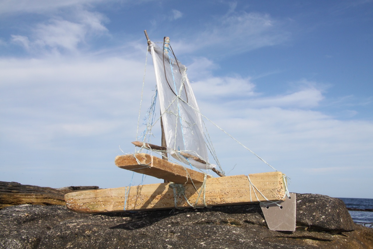 OK so this one is leaning more to the art side that the sailing side but still a good day out scavenging around the rocks and waves. A couple of feathers stabbed into an old float with a piece of wire and a broken cutlery handle forming the ballast. Evidently the ballast wasn’t enough as is sailed around well in the sea pools but when thrown out to sea past the break the feather sucked onto the water surface and stayed there.