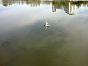 Not even a skimmer just a funny fat little barge with a spray can lid full of sand to help stabilize the hull on the water. You can see where a clothes peg came into its own fixing the sail to the biro mast and in turn to the secondary stabilizing stick that was running the glad wrap flag. This took a few minutes to put together but sailed off in a very satisfying fashion.