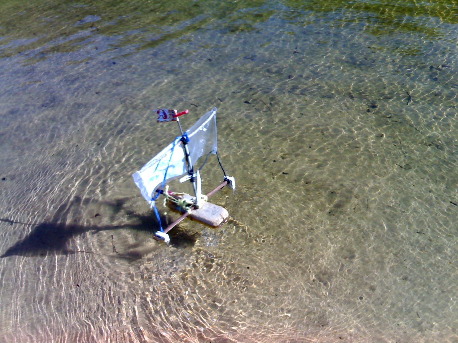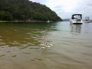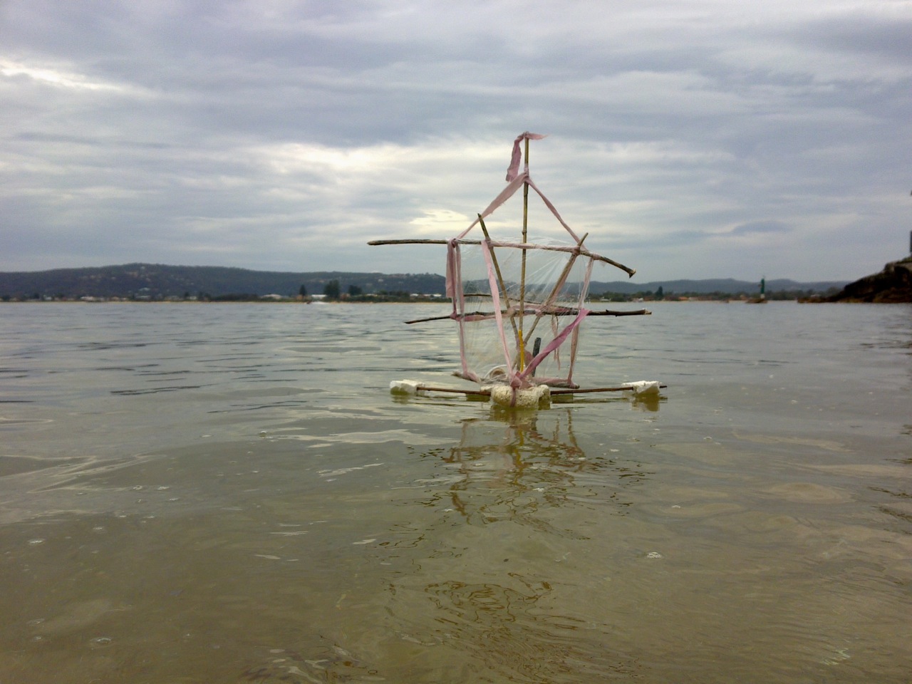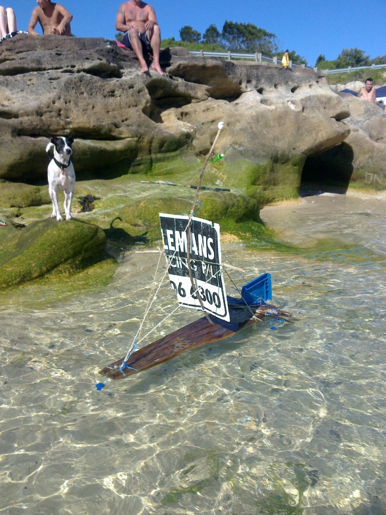 There were a number of things I enjoyed about this boat. Not least the word play. The remaining portion of this real estate agents sign not only vaguely referred to a famous car race but also the Leman Brothers company that had just collapsed in the U.S. A big graceful wooden hulled creature fixed over three PET bottles partly filled with water. The theory was that they float when on the water but attain weight when lifted out of the water such as when she is tipping to far. The main sail was located far enough forward to counter the effect of wind pulling the protruding rudder to the round and sailing backwards. In fact she sailed beautifully as you can see from the wake here pulling away from the rocks and way out in the bay in the final pictures.
