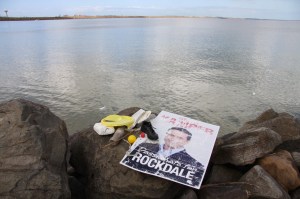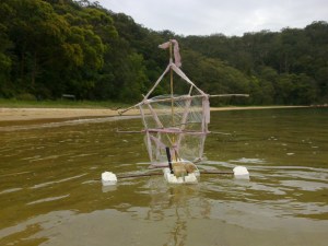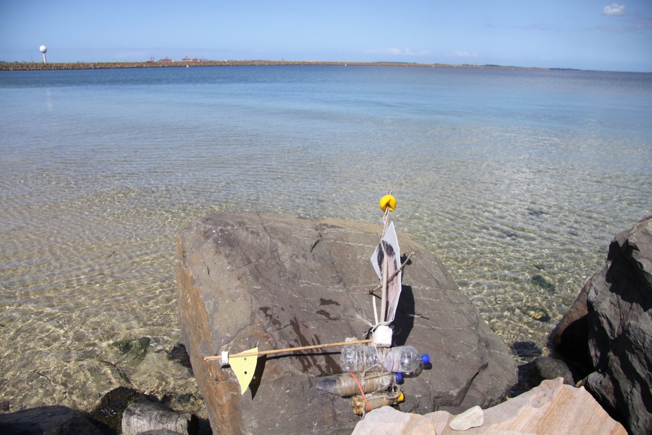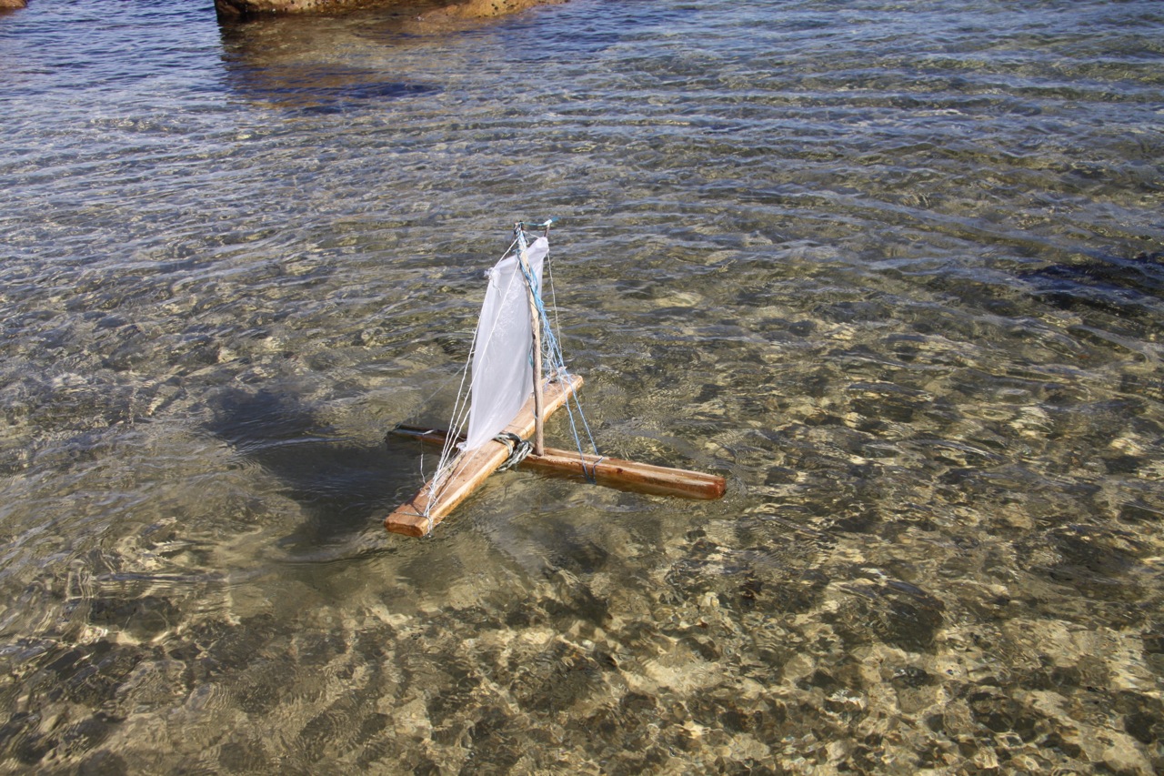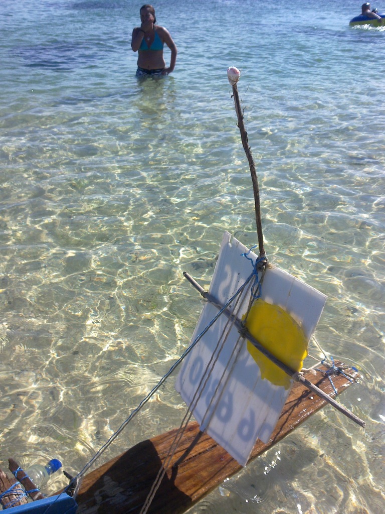 There were a number of things I enjoyed about this boat. Not least the word play. The remaining portion of this real estate agents sign not only vaguely referred to a famous car race but also the Leman Brothers company that had just collapsed in the U.S. A big graceful wooden hulled creature fixed over three PET bottles partly filled with water. The theory was that they float when on the water but attain weight when lifted out of the water such as when she is tipping to far. The main sail was located far enough forward to counter the effect of wind pulling the protruding rudder to the round and sailing backwards. In fact she sailed beautifully as you can see from the wake here pulling away from the rocks and way out in the bay in the final pictures.