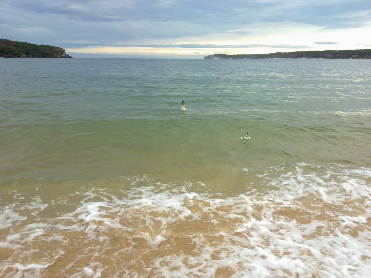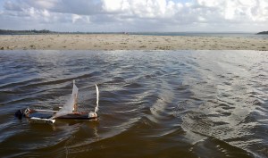 The First Fleet was a composition of foam and feather that my son put together. He called it First Fleet as it was the first time he had a real go at making a boat (not to overlook this is Botany Bay ). It sailed very well as you can see. One of its claimed features was that it could be ‘chuck launched.’ That is to say it could be launched by throwing it out behind the shore waves and it would land rite side up unbroken. The First Fleet was launched with Flying Squid at Congwong Beach