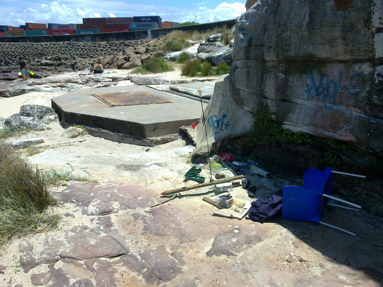 Less and learned was put together at Yarra Bay then taken over to Little Bay to be launched on the south wester. Carved foam outriggers fixed with zip cords found on the beach. A foam nose cone and plywood bow sail kept her pulling in a straight line considering the long wooden hull and main sail positioned quite far back. The other boat in pic 4 is the ‘All Prezz Express’. Less and learned took off well in the strong breeze and cleared the shore break easily. She was looking good and pulling out to sea but ultimately couldn’t clear the extensive heads to the north of Little Bay and was dragged across and smashed onto the rocks in spectacular fashion by the large swell out on the point. You can just make out about half way across the bay in picture 5 taken with the zoom on my phone.