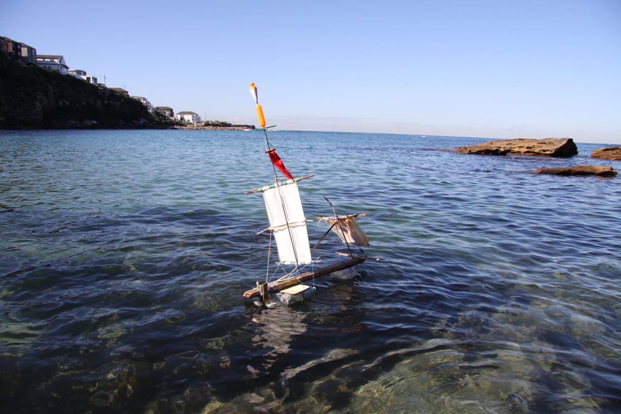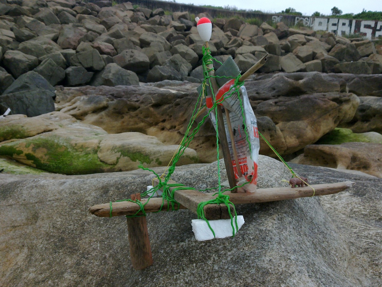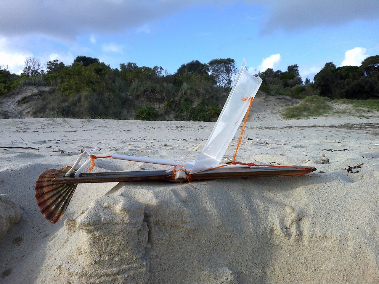 The Eric was a prolonged experiment that involved a couple of test launches while waiting for a suitable off shore winter breeze to sail her out into the Pacific. She was first cobbled together from flotsam collected along the rocks at Yarra Bay and test sailed from the tip of the artificial wave break back to the beach. The hull was a timber, PET bottles and foam combo with half a brick tied under it on some timber lengths. This was one of the first self righting non skimmer style boats. The mast was from lengths of abandoned fishing rod fixed together and the main sail was cut from a washed up deck chair. A float and a bit of red cloth were fixed from the crows nest a a means of greater visibility for longer should a successful sea launch be achieved.