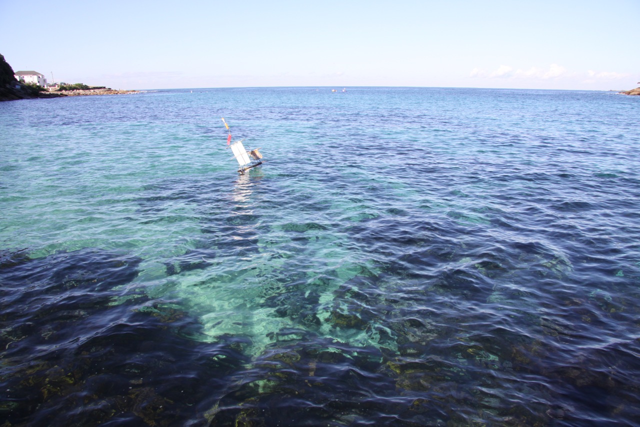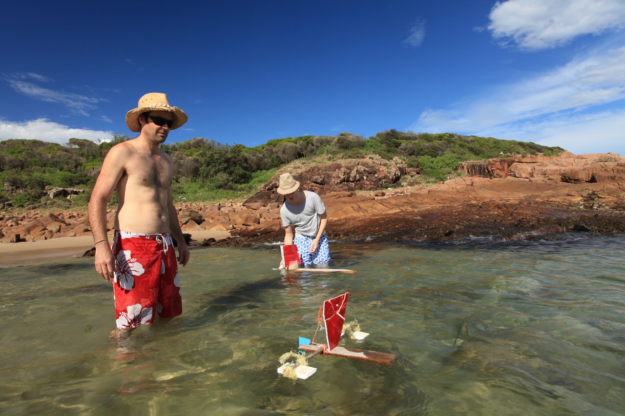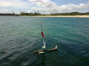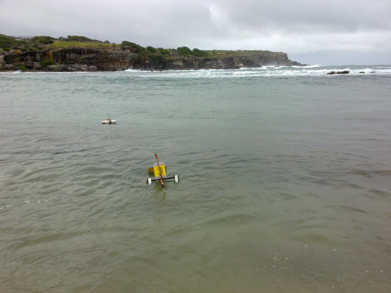 The Eric was a prolonged experiment that involved a couple of test launches while waiting for a suitable off shore winter breeze to sail her out into the Pacific. She was first cobbled together from flotsam collected along the rocks at Yarra Bay and test sailed from the tip of the artificial wave break back to the beach. The hull was a timber, PET bottles and foam combo with half a brick tied under it on some timber lengths. This was one of the first self righting non skimmer style boats. The mast was from lengths of abandoned fishing rod fixed together and the main sail was cut from a washed up deck chair. A float and a bit of red cloth were fixed from the crows nest a a means of greater visibility for longer should a successful sea launch be achieved.