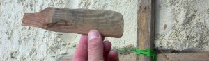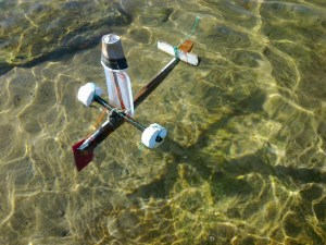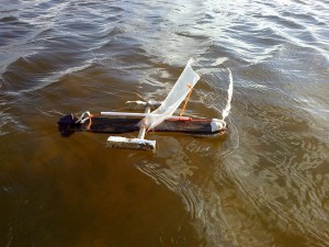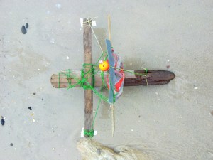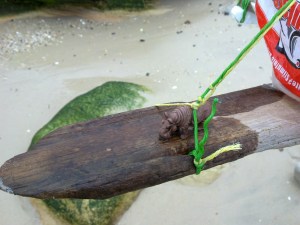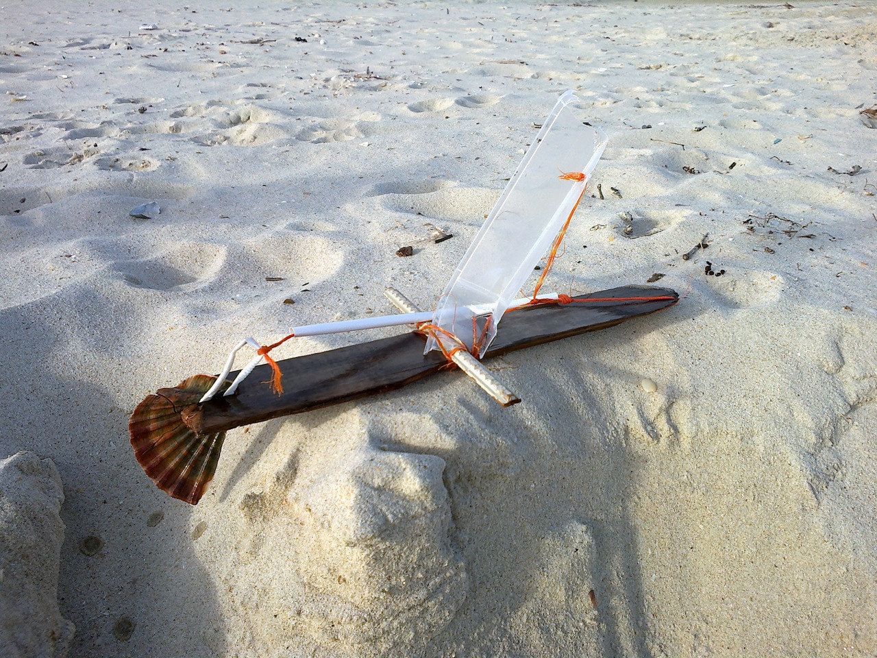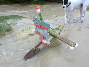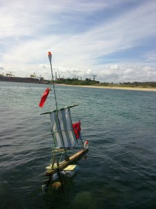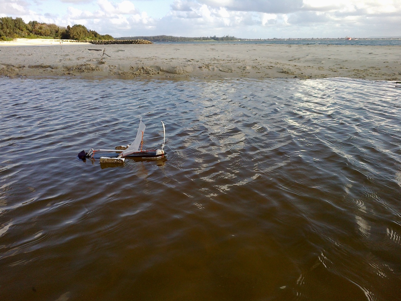 The crucifix timber hull and the discovery of the little plastic hippo led my son to the name of this boat. Another skimmer. Composed of vivid green rope, around a timber hull and a wooden rudder carved with a pocket knife. The sail is a prawn bait packet and the float was added to the crows nest to make it more visible further out. This boat was near as wide as it was long but setting the outriggers far enough back behind the mast seemed to overcome this and it sailed surprisingly well on and out towards the heads. Not being a particularly windy day a little blade of foam was added above the main sail to add thrust.