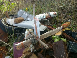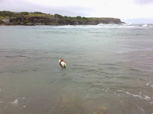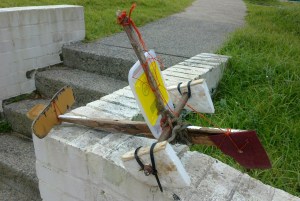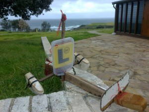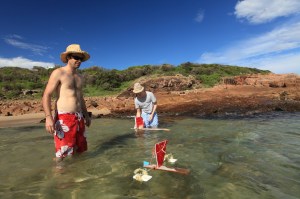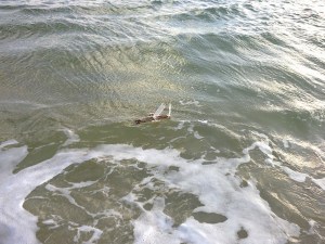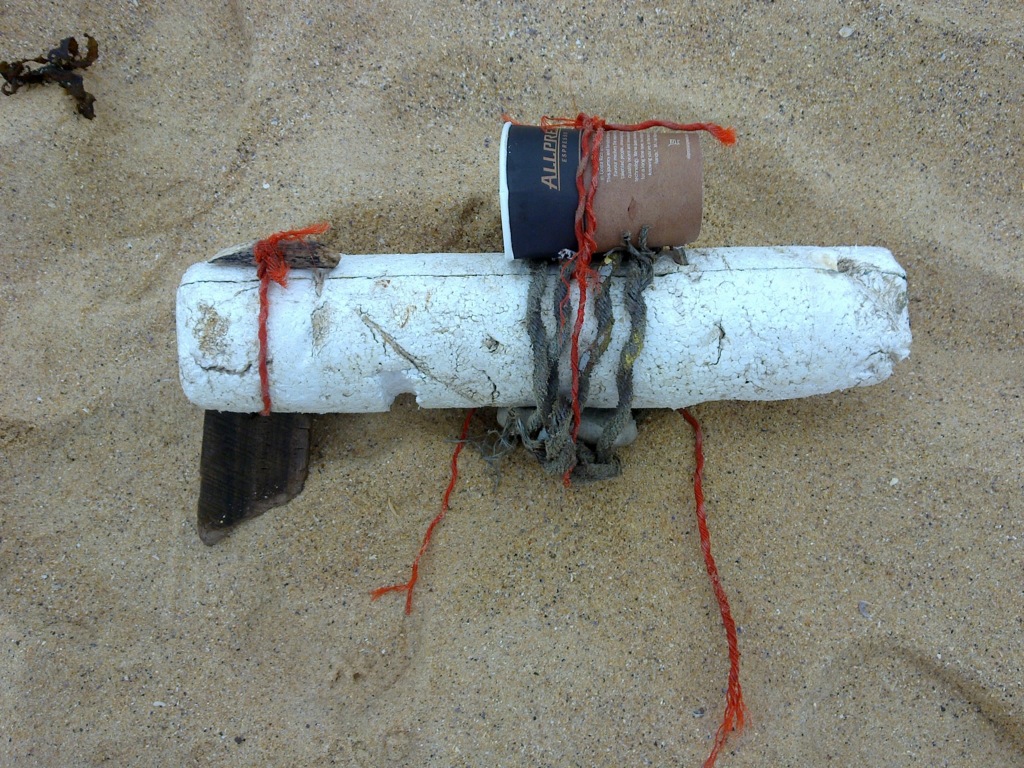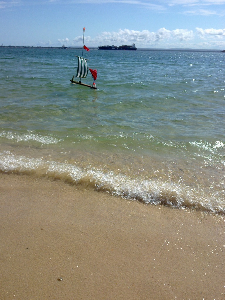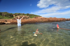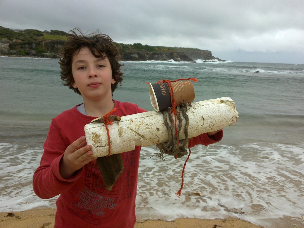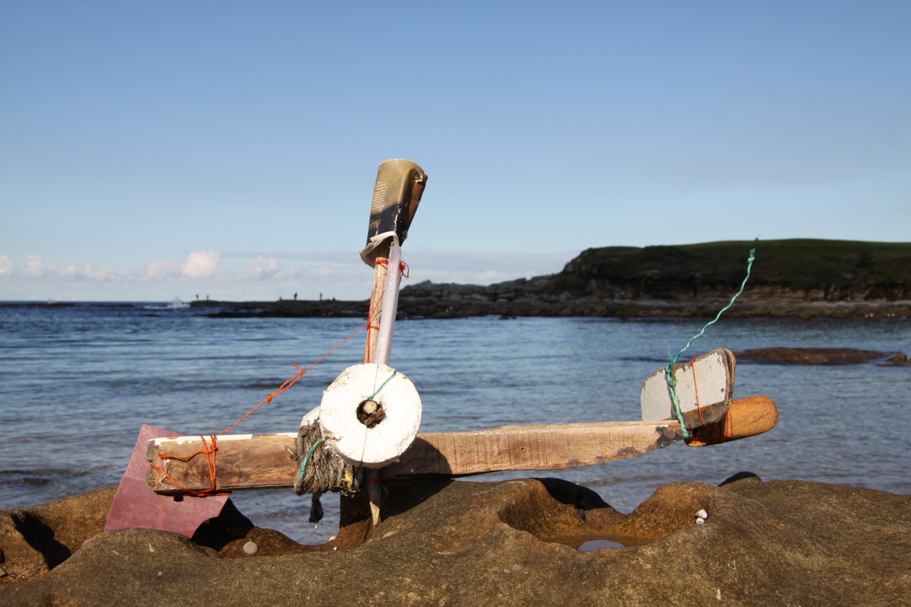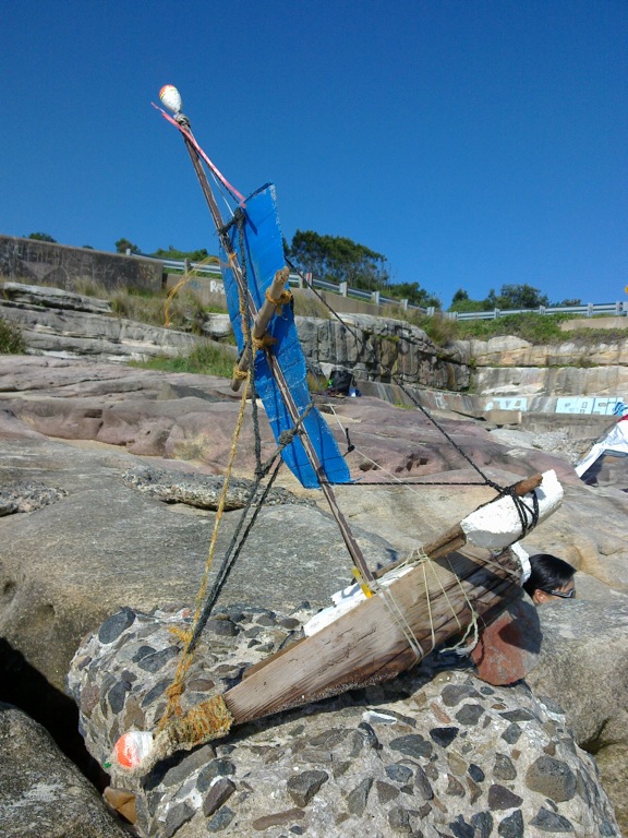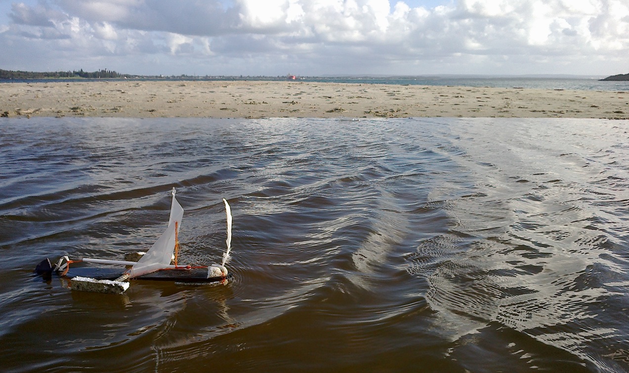 The All Prezz Exprezz was a fine little craft created by my son. A cylindrical foam core hull with a carved wooden rudder, a coffee cup as a sail, a lump of sandstone roped to the hull as ballast and a honed wooden peg used to tension the rudder rope. She took of quite well in the steady south westerly breeze but was unable to clear the heads and ‘did a double whammy’ into the rocks on the other side of Little Bay.