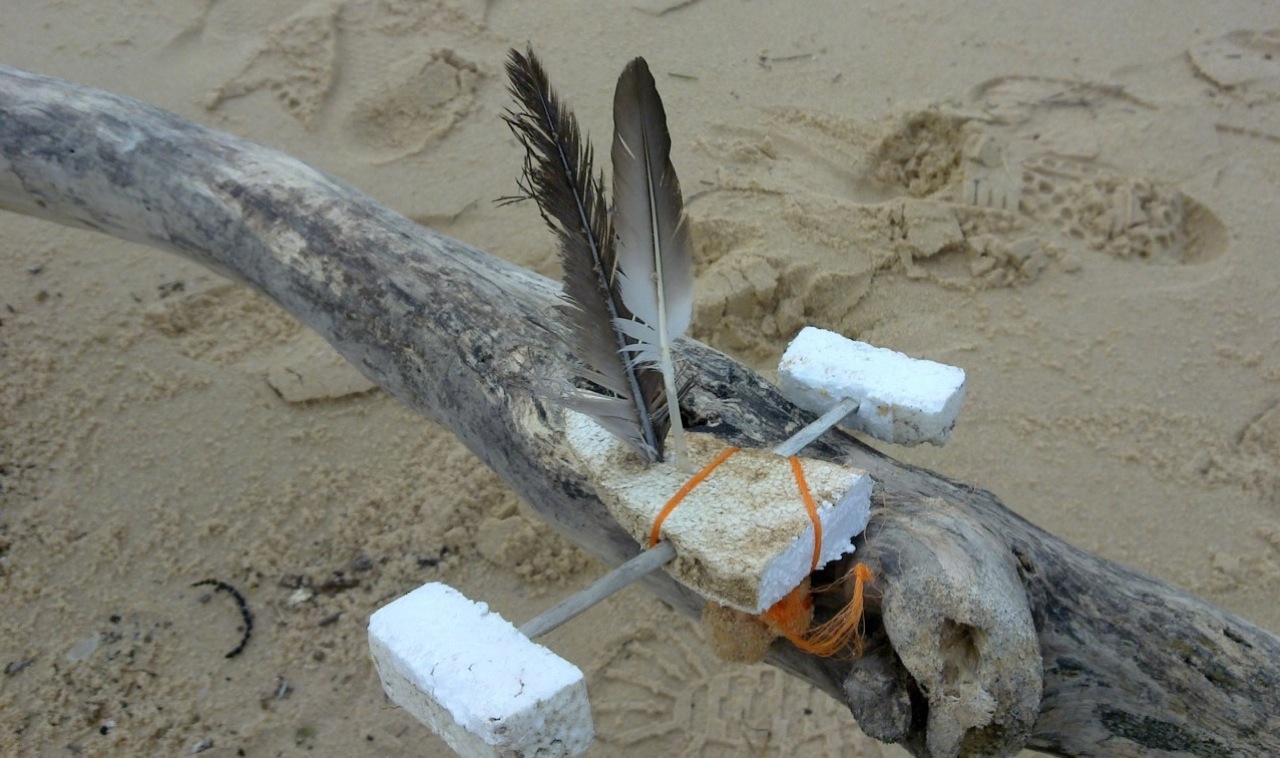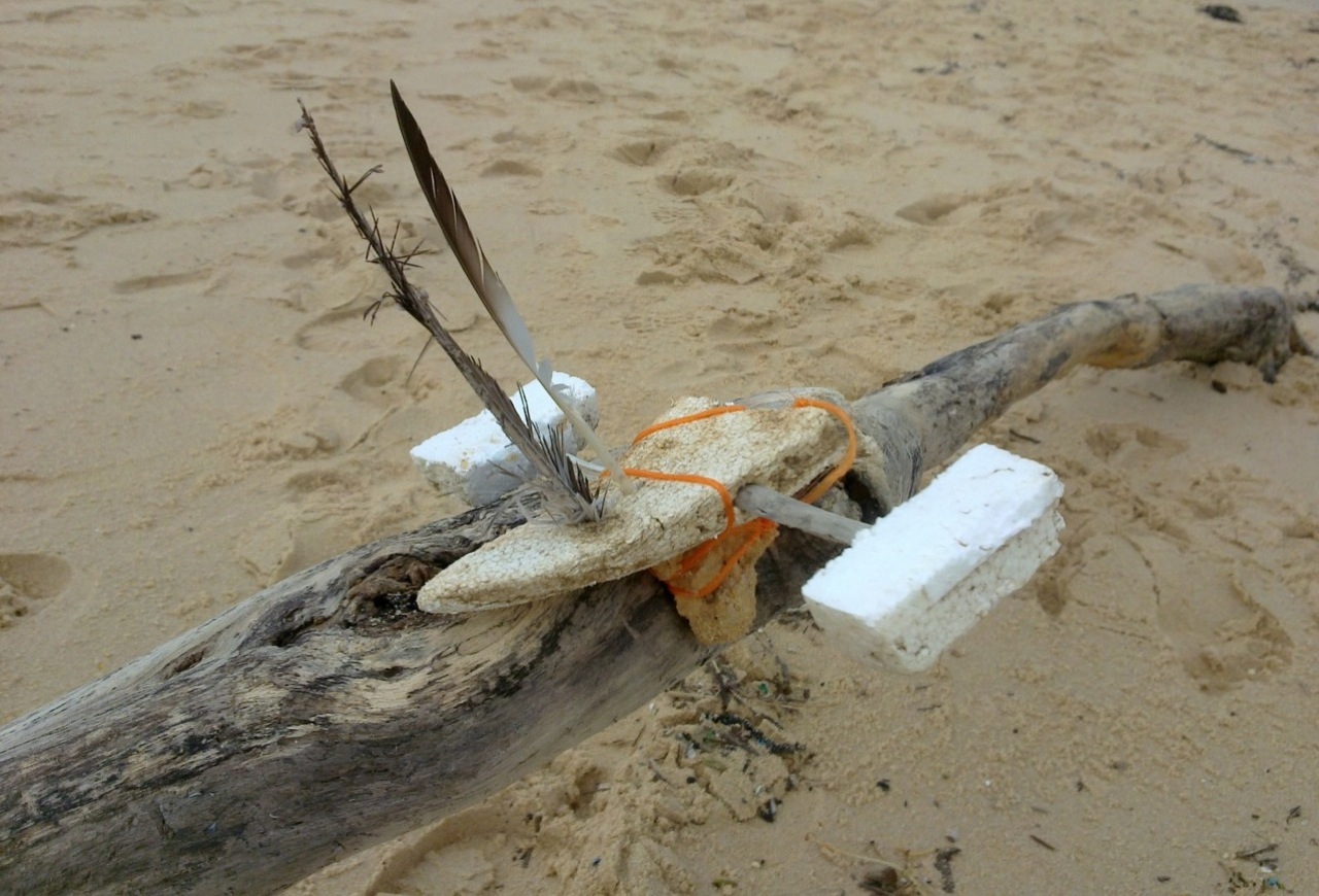 The primary components of the Flying Squid are the squid cuttle hull and the pelican feather sail. This was a fast construct on Congwong Beach after a bush walk around the headland with my son. The outriggers are cut foam pinned on stripped down pelican feathers. The keel is the corner of a plastic chopping board pushed through the hull and held up with a length of bamboo pushed through a cut hole. The whole thing tightened down with a scrap of orange plastic rope. The multi feather sail was just stabbed into the deck. It sailed surprisingly well and steadily made its way out towards the heads.