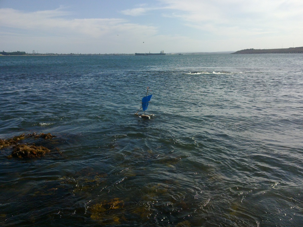 We finally found a morning with favorable winds and took the Eric down to Gordon s Bay where we determined we could get a sea bound launch of the rocks with some cover from the bay. Unfortunately I had set the rudder to far to the left and she pulled across the SSW and possibly into the rocks on the other side of the bay rather than clearing the headland and heading out to sea. Though we will never know as we had run out of time and were watching from a headland above as she sailed under our view and we had to leave. You can also see here that the fore sail had subsequently been re rigged in a more similar style to the main sail also cut from a washed up deck chair.