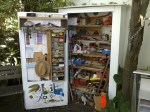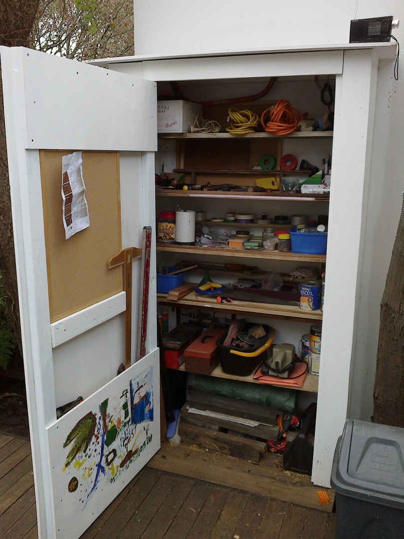 The Mantry or Man Pantry is what happens when your bits don’t fit behind the laundry door and you have to trade off against available useable courtyard. It’s a walk up shed. And it has proven very effective in serving its purpose and as a complimentary item to ITEM 11 Chalk and Chop. The entire shelf system and structure of the shell is comprised of timber found in the street or skips including the deck extension that forms the base. Only the final cladding of thin ply was purchased and painted.The artwork on the base of the door is by my son. The brief was to paint his interpretation of the stories I have told him from the year i lived in Africa. It got pretty weird.