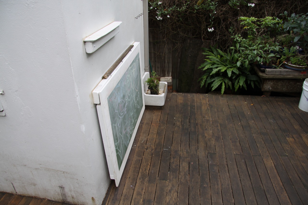 And so the Chalk and Chop came about. Made from all found timber except the flat top that is a cut of painted ply. Some structural framing was added under the flat top to stiffen it and the piece under the front edge has holes bored in it to take the top of the cut down wooden broom handles (street found) the base of these pull out legs has a screw in it that sits in a hole in the deck making it impossible to knock the legs out. The real beauty of this system is that the very lightweight pull out legs are perfectly sufficient because of their high compressive strength and the top board being fixed in three places by hinges of the timber wall ledger. As you can see when it is folded down the skinny legs just sit on top held by the hinge backs and the worktop becomes a chalkboard. Apart from a workbench it has turned out to be a very handy standing height BBQ serve your self food set out area.