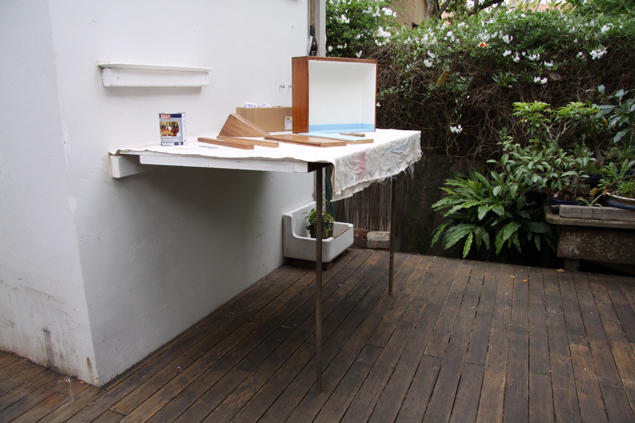 Yes that’s correct, there are 2 ITEM 14s. But there is no ITEM 13. 2CBBB (TWO COFFEE BANANA BREAD BOOK) or ‘Seaman’s Table’ was created for my cousins courtyard (by request). Symmetric left and right but having deliberate front and rear face to place up to a wall. This unit is created out of restored driftwood collected along the Sydney coast. I am not sure how many individual trees contributed to the final product but I estimate there are at least 10 different species of timber incorporated. Other materials include rope and coloured plywood sheet salvaged from the beach, adjustable screw leg bases recovered from a thrown out kitchen table (picture 4) and coloured wax used to seal the fixing heads. The thinner battens across the top surface are salvaged from a thrown out futon base. The rope is woven through base structure and tied under high tension binding the fixing points together. There is also an old section of picture frame fixed under the top surface to hold a pencil for those epiphany moments during a morning coffee session.