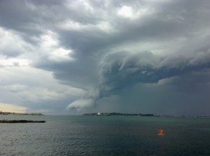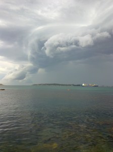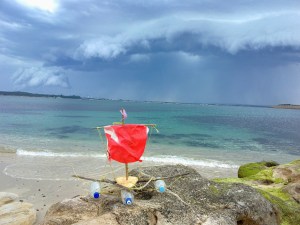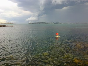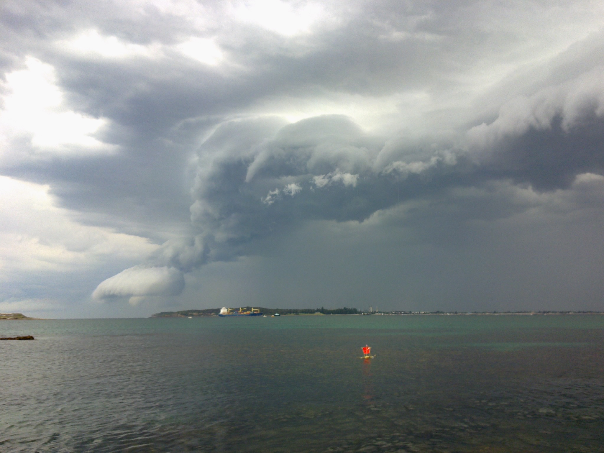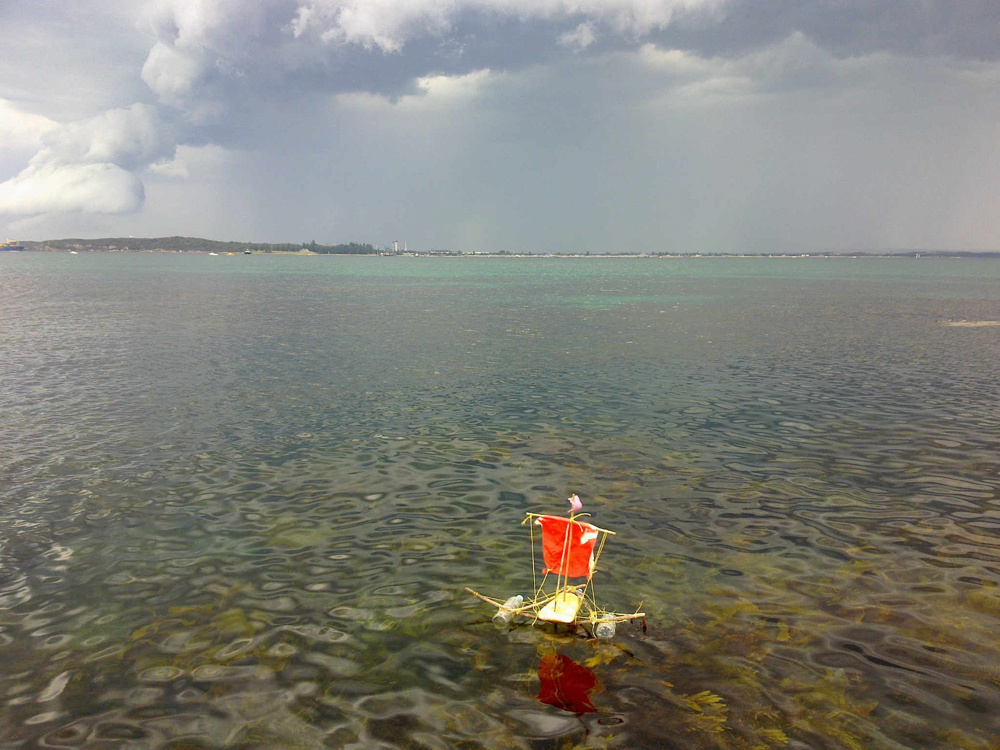 This storm was rolling up the coast over Botany Bay as the Storm Rider was being composed and then launched out towards the heads across the Bay. She employed an experimental PET bottle triple hull holding some water for stability and sported a flash red PVC sail from some long abandoned floaty toy wedged in the rocks, a carved timber blade rudder and a wedge of surfboard foam as the main hull. Note the tanker in the background in pictures 5-9 and the lack of reflection on the water from the light conditions. Not to mention the cloud formations over the Kurnell Peninsula.